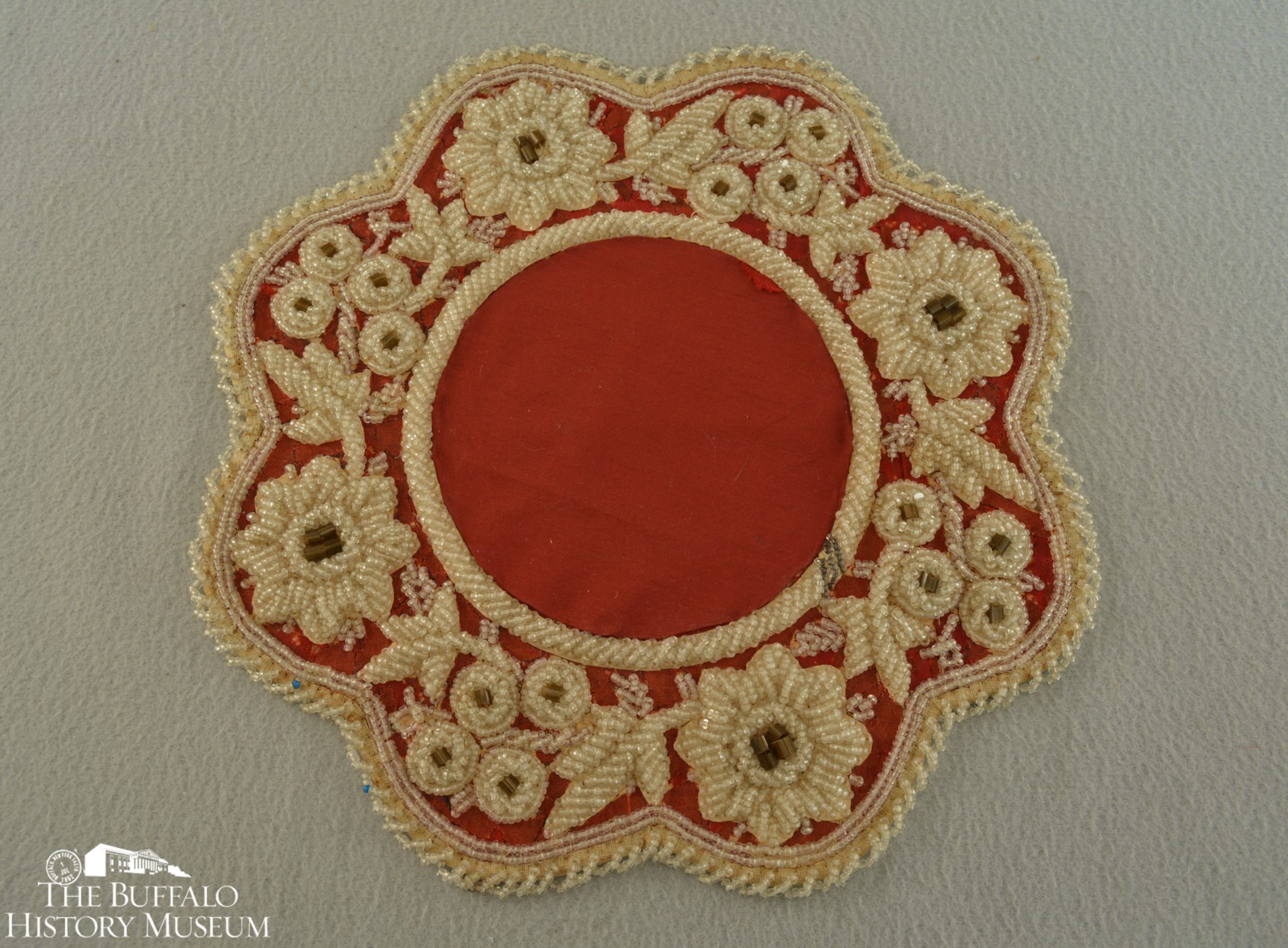 A lamp mat likely made by a Tuscarora artist as souvenir art. This 19th century style of beadwork blended traditional Haudenosaunee (Iroquois) patterns with Victorian fashion elements and household accessories.