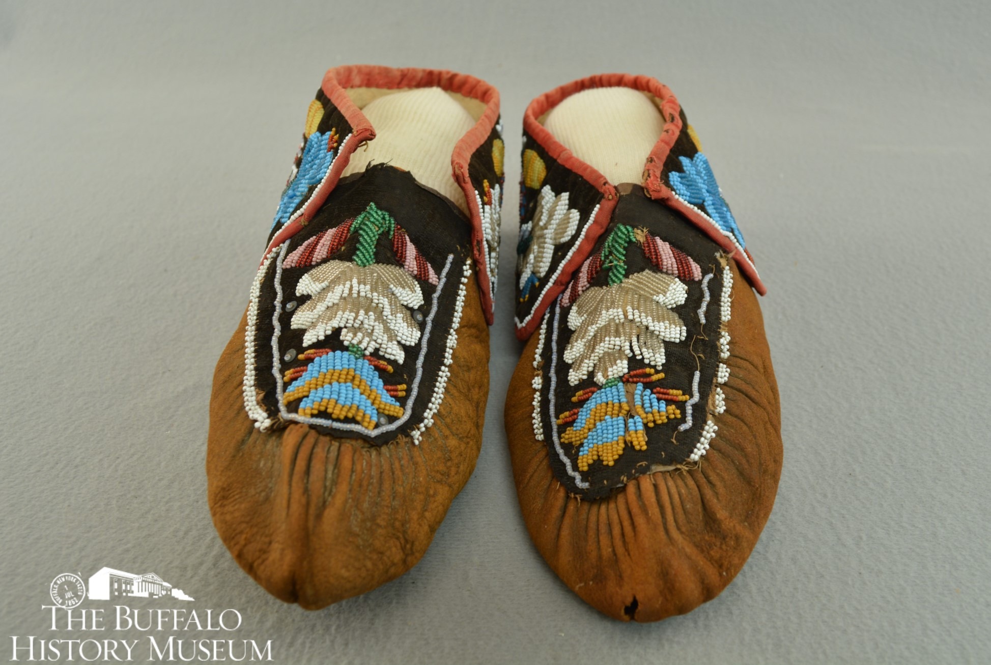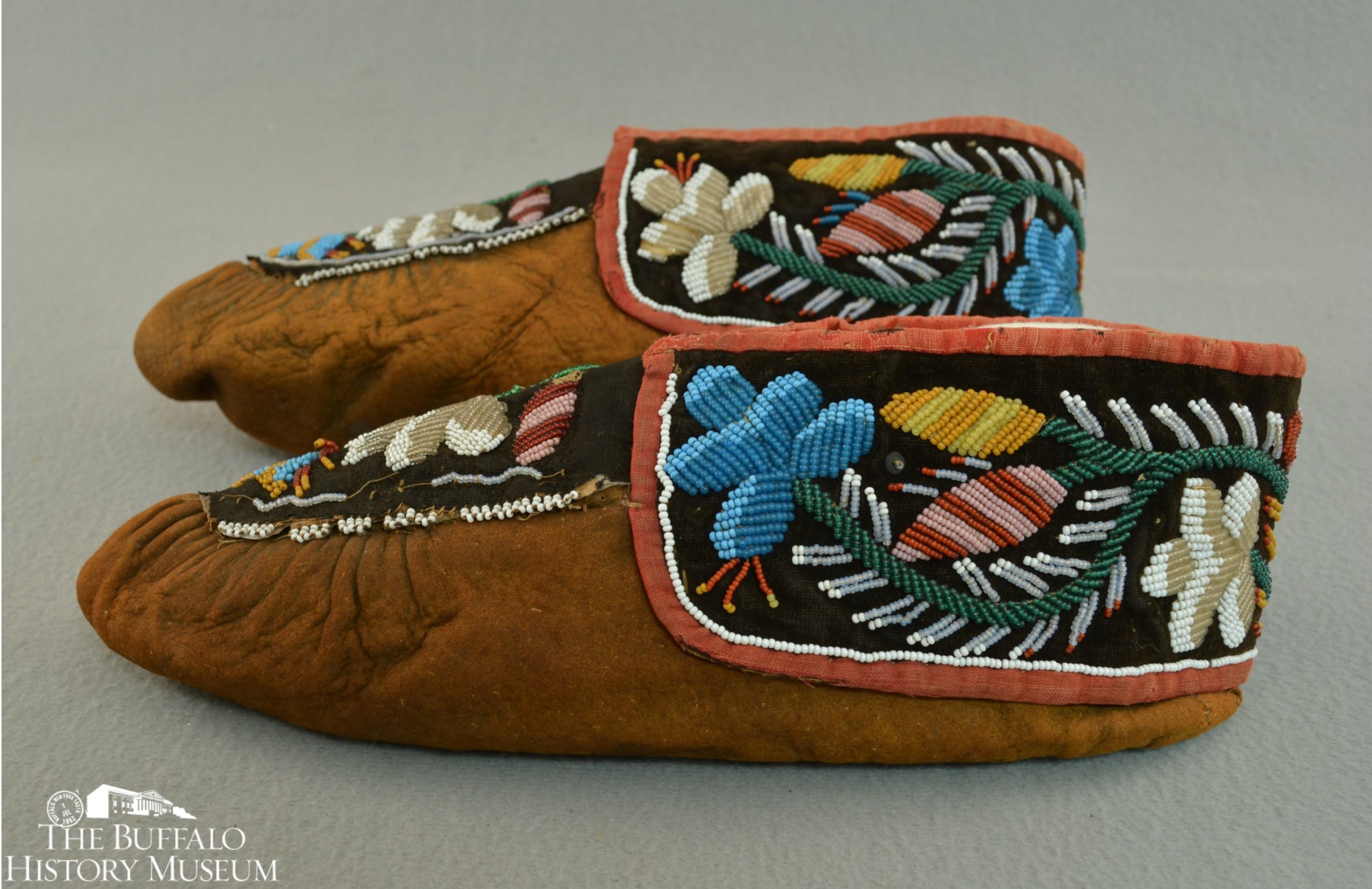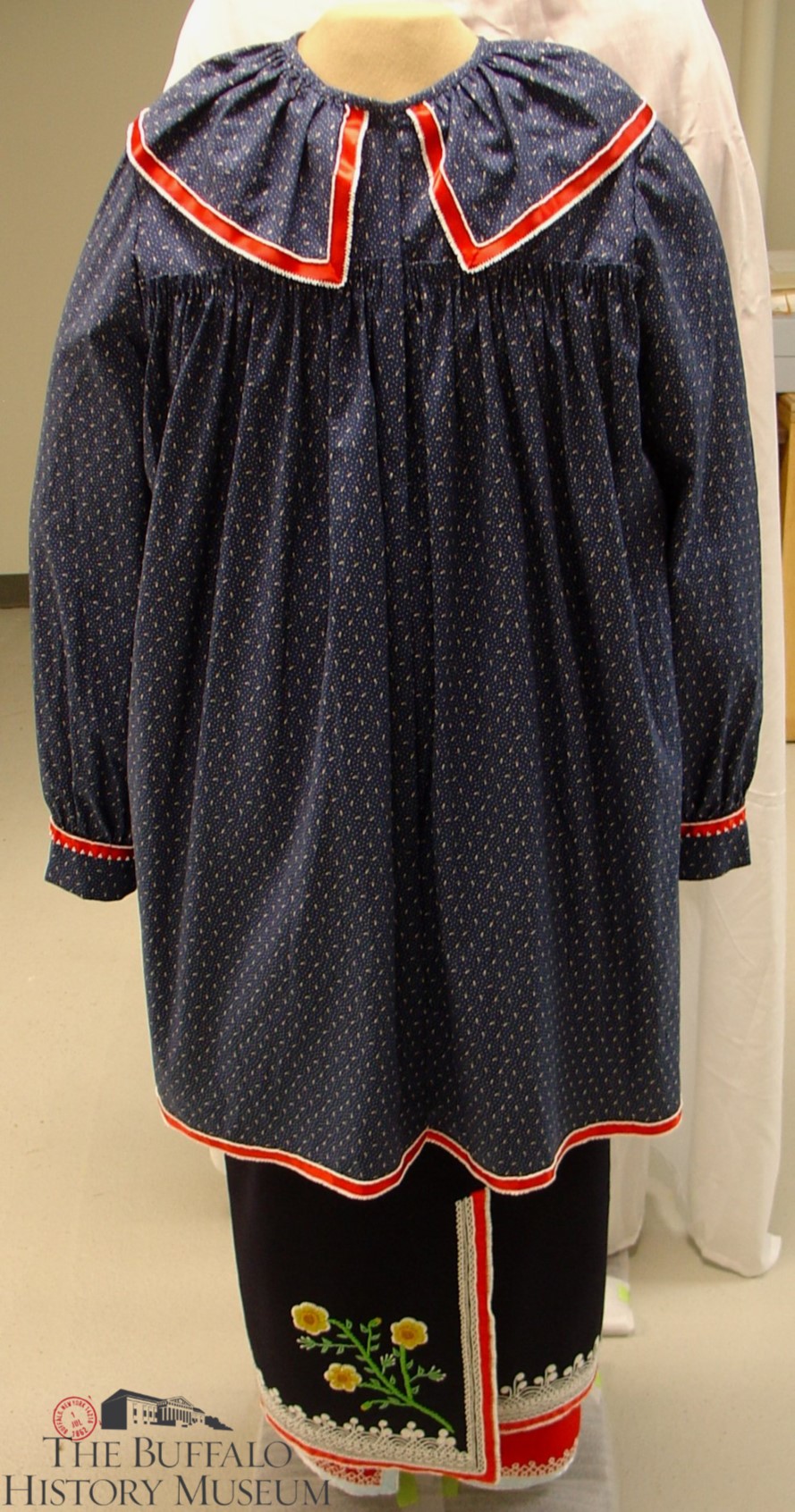 Reproduction of clothing for a Seneca woman in the 1850s, based on an 1848 daguerreotype of Caroline G. Parker (1824-1892). Parker was a prominent member of the Seneca nation and sister of General Ely Parker.