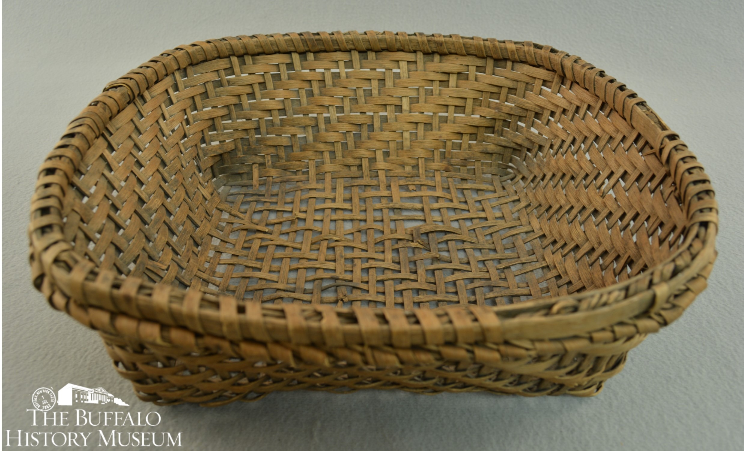 This Seneca basket, used for sifting hominy corn, was used on the Cattaraugus Reservation by Mrs. William Crow.