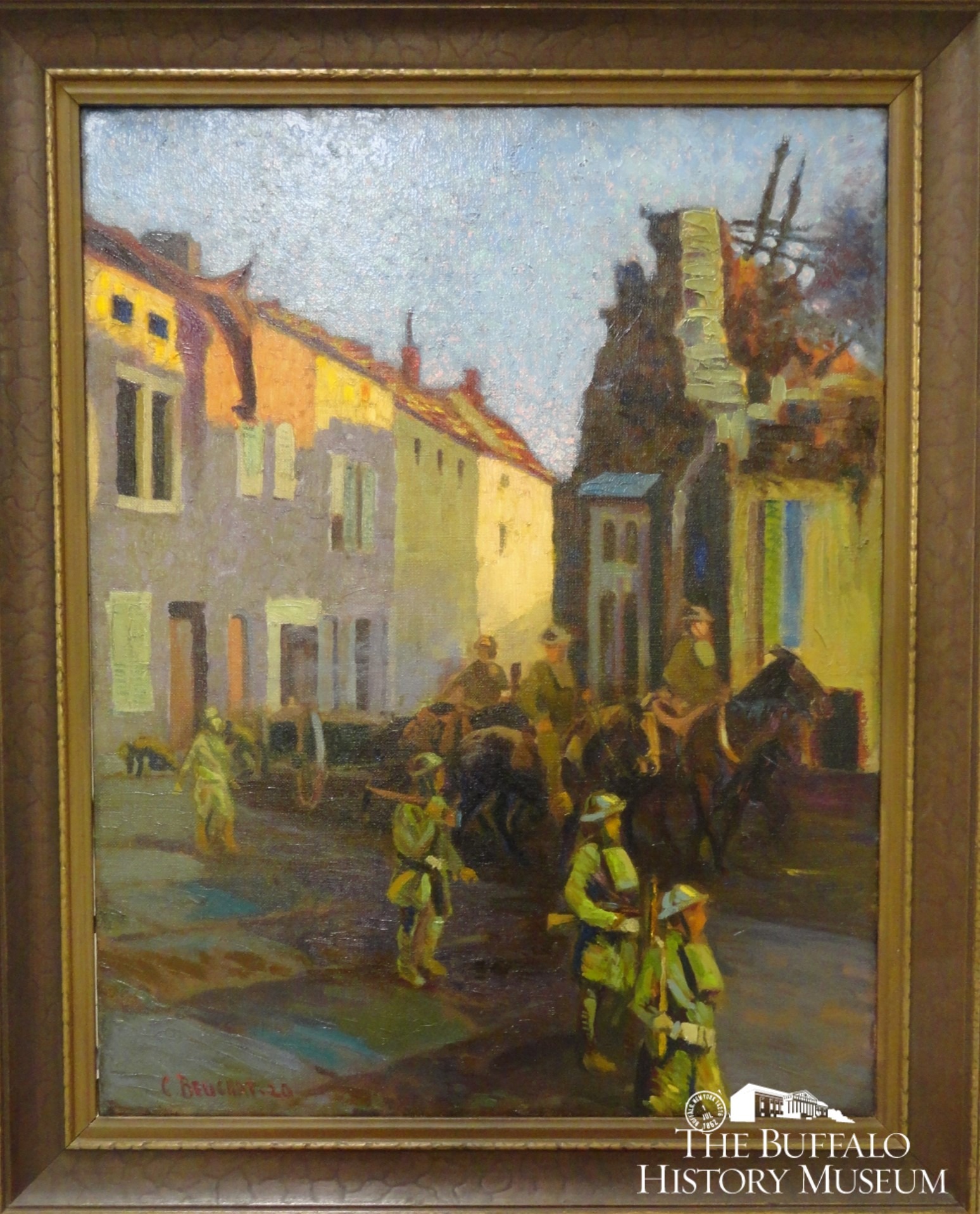 This piece depicts a group of World War I soldiers on horseback in the town of Thiaucourt, France, most likely illustrating the remains of the town during or after the Battle of Saint-Mihiel. Clement Beuchat was born in Buffalo, NY on March 28, 1891. He attended the Buffalo Fine Arts Academy and eventually joined the New York National Guard 78th Division.