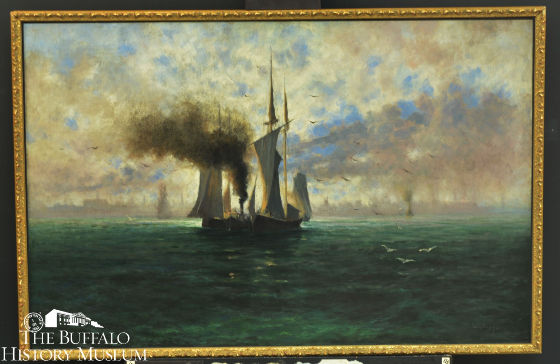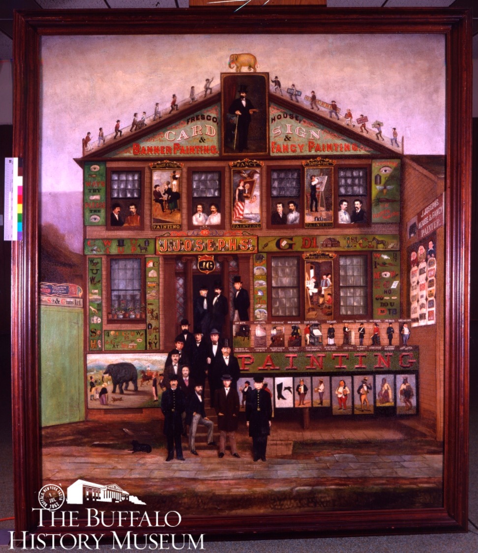 This painting was done by Joe Josephs in commemoration of the dedication of his sign shop in June 1869, located on Exchange Street near Washington. Josephs referred to this painting as a “souvenir of old Buffalo.”