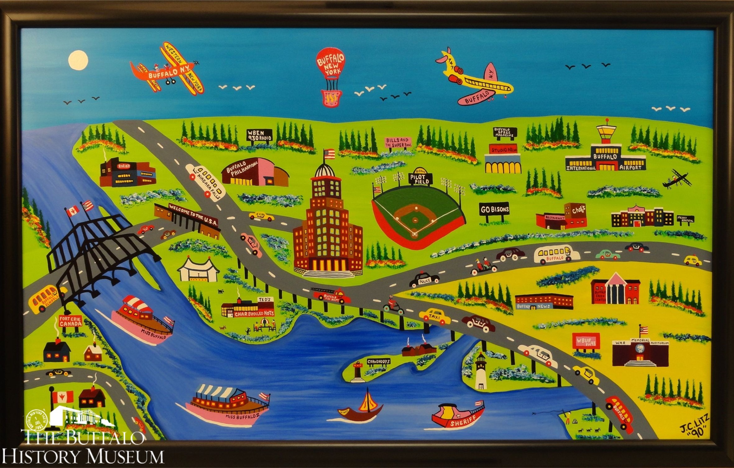 James C. Litz began painting in 1982 with no formal training, focusing on scenes that have meaning to his life, particularly Western New York landmarks. His bright colors and exuberant style captured the energy of a Buffalo summer as the region looks forward to a new century.