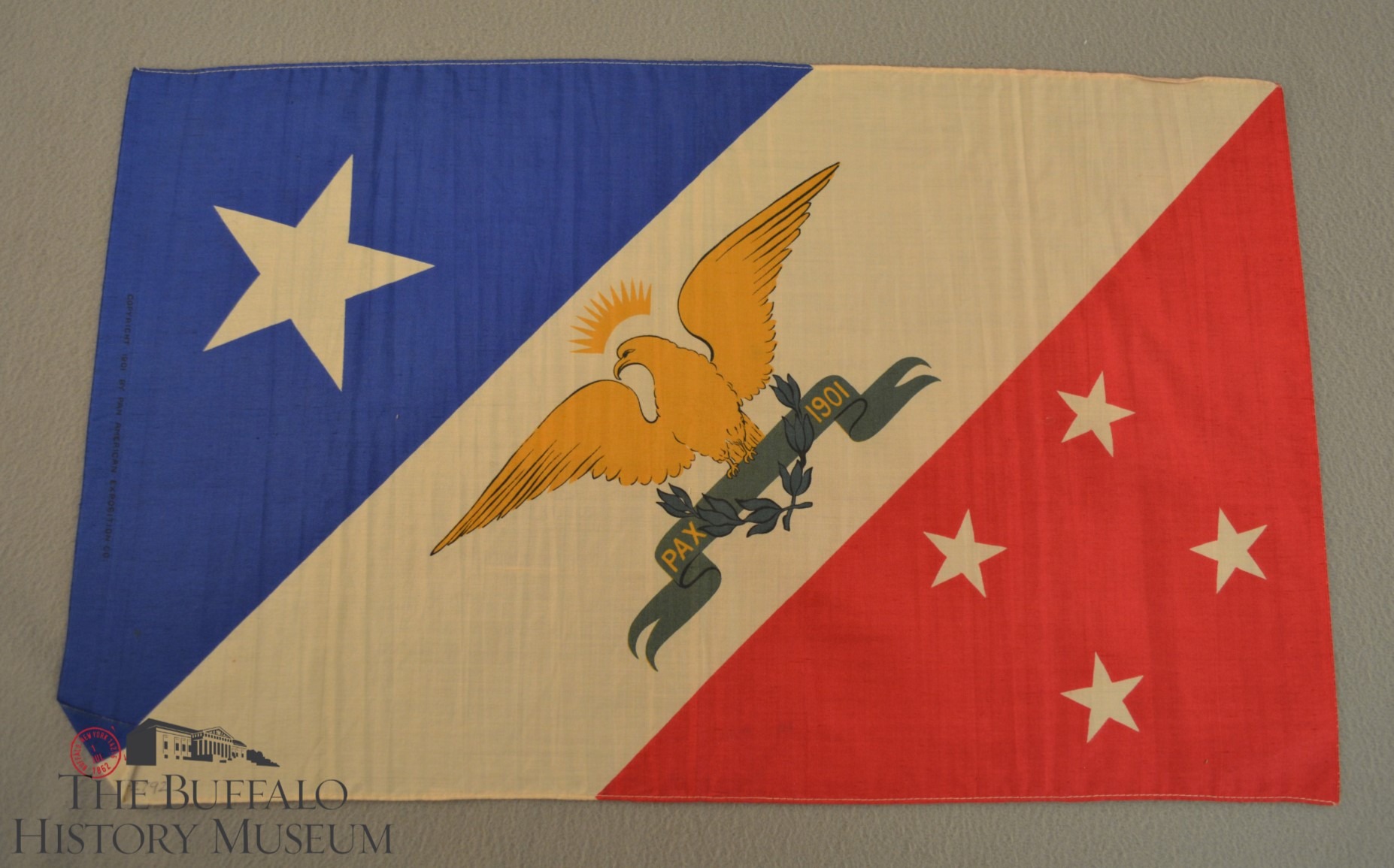 A silk flag featuring Adelaide Thorpe’s official design for the Pan-American Exposition. The design features elements that represent North and South America with the white bar in the middle for unity.