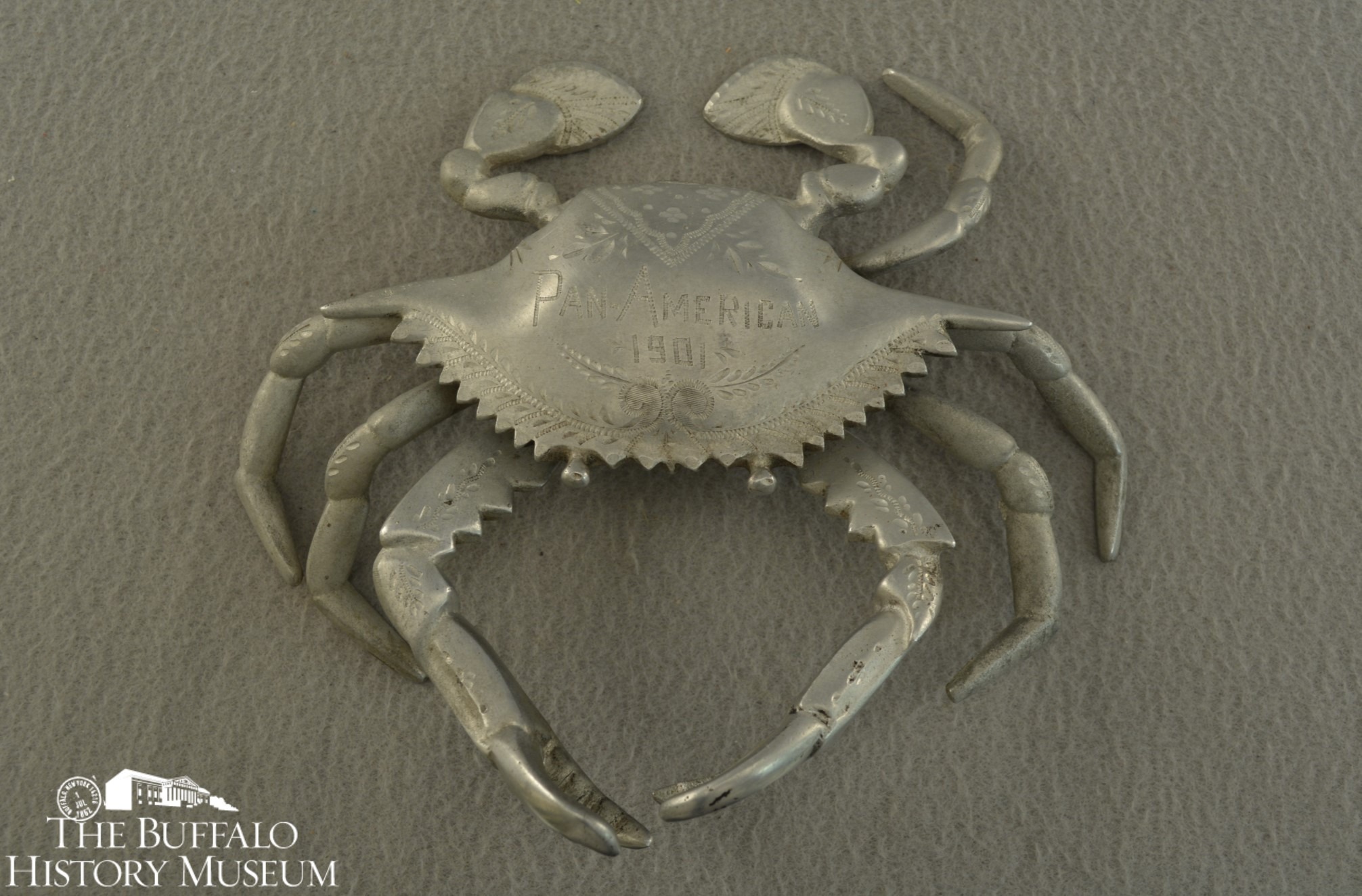 A crab-shaped inkwell sold as a souvenir at the Pan-American Exposition. At the time, the process of making aluminum was only beginning to become affordable so souvenirs made from aluminum, a previously expensive material, were very popular.