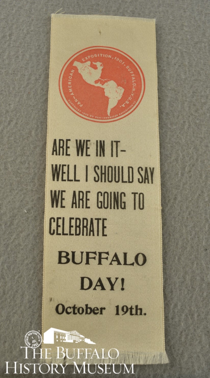 A white silk ribbon commemorating “Buffalo Day”, a day of special admission for Buffalo residents, at the Pan-American Exposition on October 19, 1901.