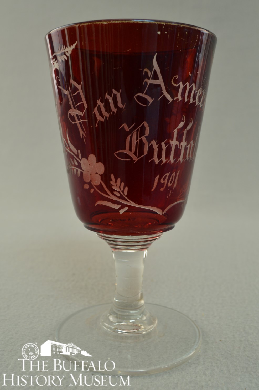 A ruby flashed souvenir glass goblet sold at the Pan-American Exposition.