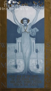 Evelyn Rumsey Cary (1855-1924) was the daughter of Bronson C. Rumsey, a founder of the Buffalo Arts Academy. She was an active member of the Buffalo artistic community and exhibited work with the Buffalo Society of Artists and the Buffalo Fine Arts Academy. Evelyn was a member of the Board of Women Managers for the Pan-American Exhibition, and, in 1898, she painted the “Spirit of Niagara”, which became the basis for the poster used to advertise the exhibition. In 1907, she created “Give her the fruit of her hands, and let her own works praise her in the gates”, one of the most prominent visuals used in the American suffrage movement. Evelyn’s suffrage poster is currently on display upstairs in Continuum.