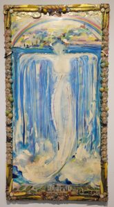 Gerald Mead, Pan Am Reliquary (4PTT) | “This small reliquary-like assemblage incorporates images and artifacts associated with the Pan-American Exposition held in Buffalo in 1901. These include images of the “Spirit of Niagara” poster, the Exposition’s seal and a Pan-American postage stamp. The authentic miniature artifacts in it are threads from a ribboned certificate and a fragment of a hand-made nail from one of the Exposition’s buildings.” |