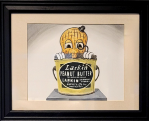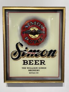 This work by artist Yames is inspired by the 1934 bottle label from the William Simon Brewery, one of Buffalo’s oldest independent producers of beer and ales. The gold leaf and paints are applied to the backside of the glass, one layer at a time, creating a perfectly smooth image surface.