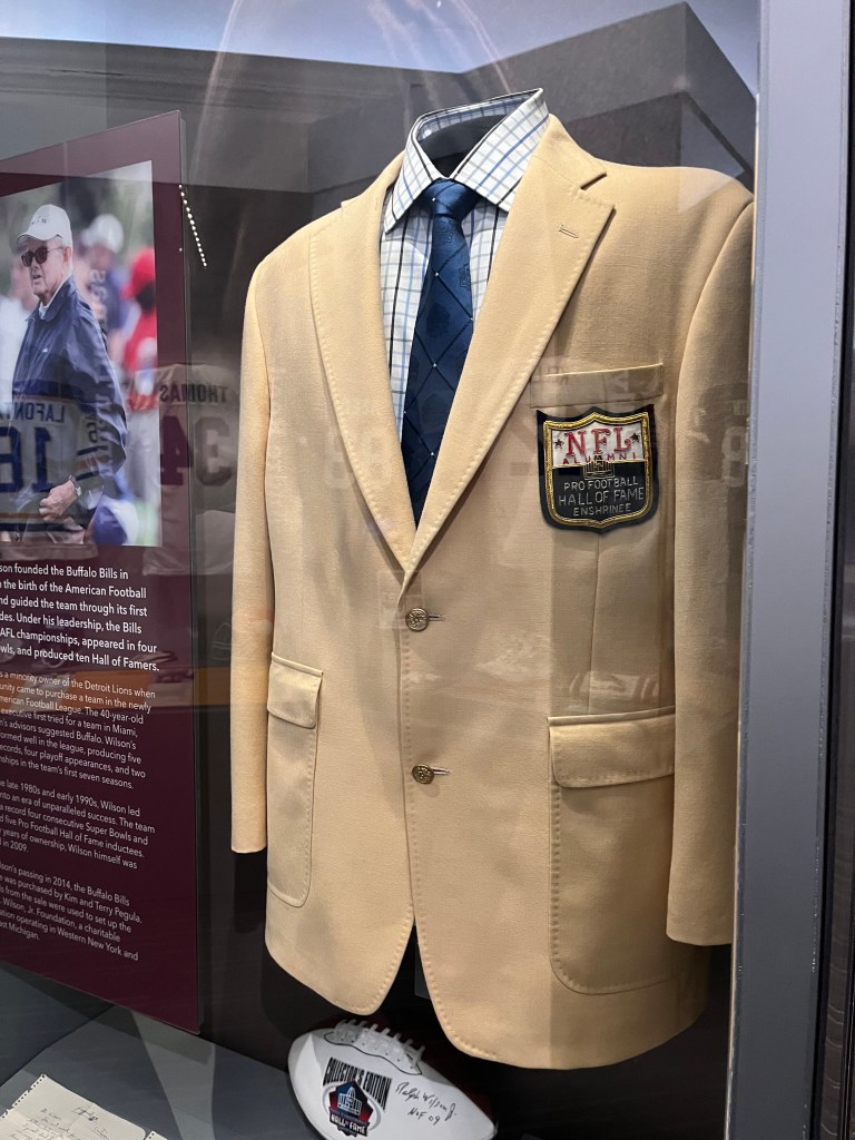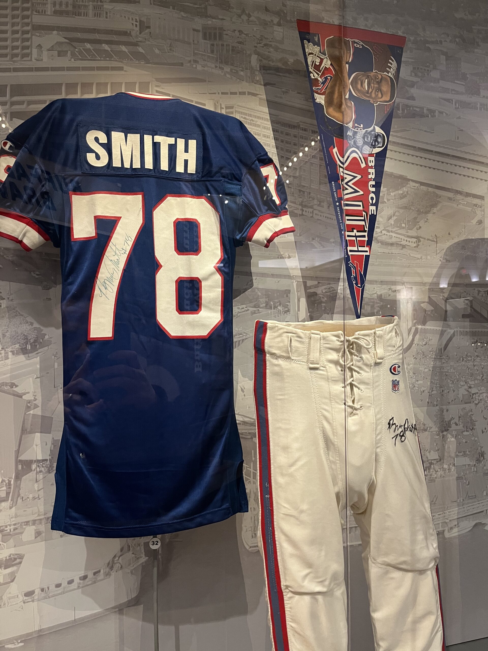 Perhaps no Bills era is better represented inside the Bills exhibit than the late 80s/early 90s team who fought their way to the Super Bowl four consecutive times. You can see jerseys, gloves, cleats and much more from the slate of legendary players who became household names across America. Defensive end Bruce smith has his jersey, pants, and a commemorative pennant on display.
