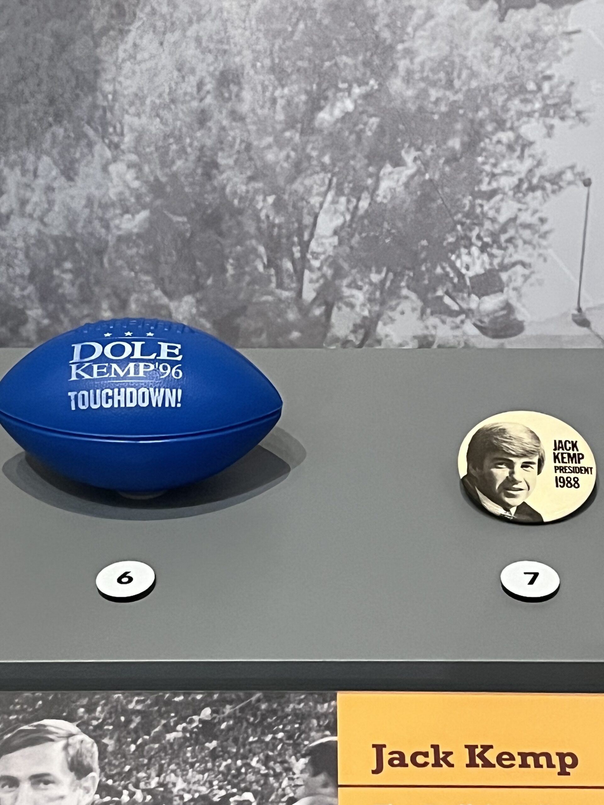 When Bob Dole selected his running mate in the 1996 presidential election, he turned to Jack Kemp, the former Buffalo Bills quarterback and Congressman who led the team to back-to-back AFL championships in 1964 and 1965. Kemp’s former football career helped inspire this “Dole/Kemp ’96 Touchdown!” campaign football in 1996.