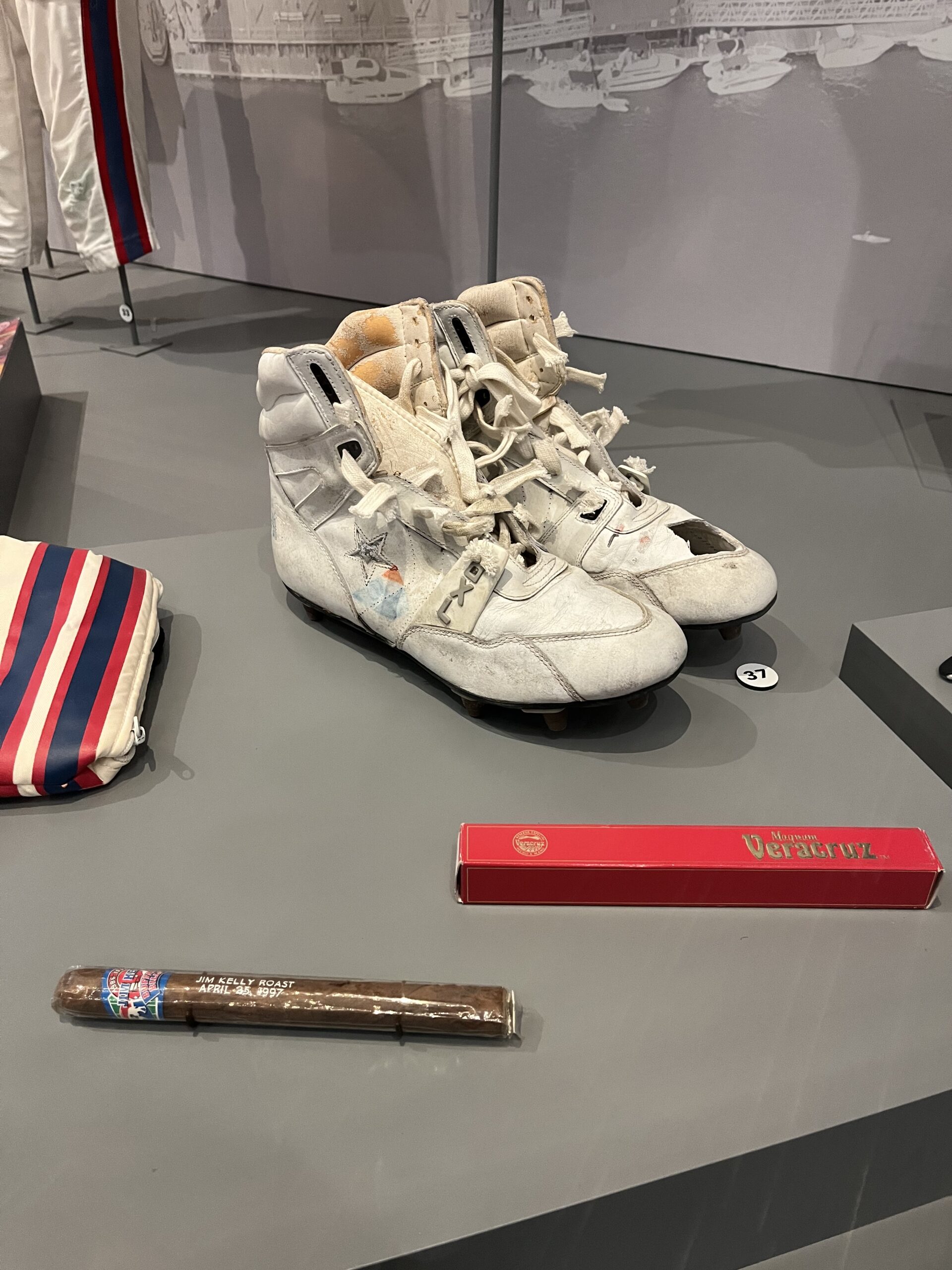 Any shortlist of the greatest Bills of all time always includes Jim Kelly. The quarterback steered the Bills through its extraordinary playoff run in the early 1990s. Kelly capped off his career following the 1996 season, and this commemorative cigar on display (in front of the cleats he also wore) is from a roast in honor of his retirement.