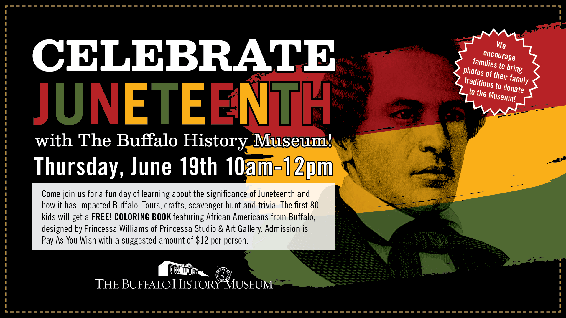 Come join us for a fun day of learning about the significance of the holiday Juneteenth and how it has impacted Buffalo. We will have free tours at 10:30 AM, 11:00 AM and 11:30 AM. Please reserve a spot here. We will have a craft, scavenger hunt and trivia. The first 80 kids that come… Continue Reading Celebrate Juneteenth!