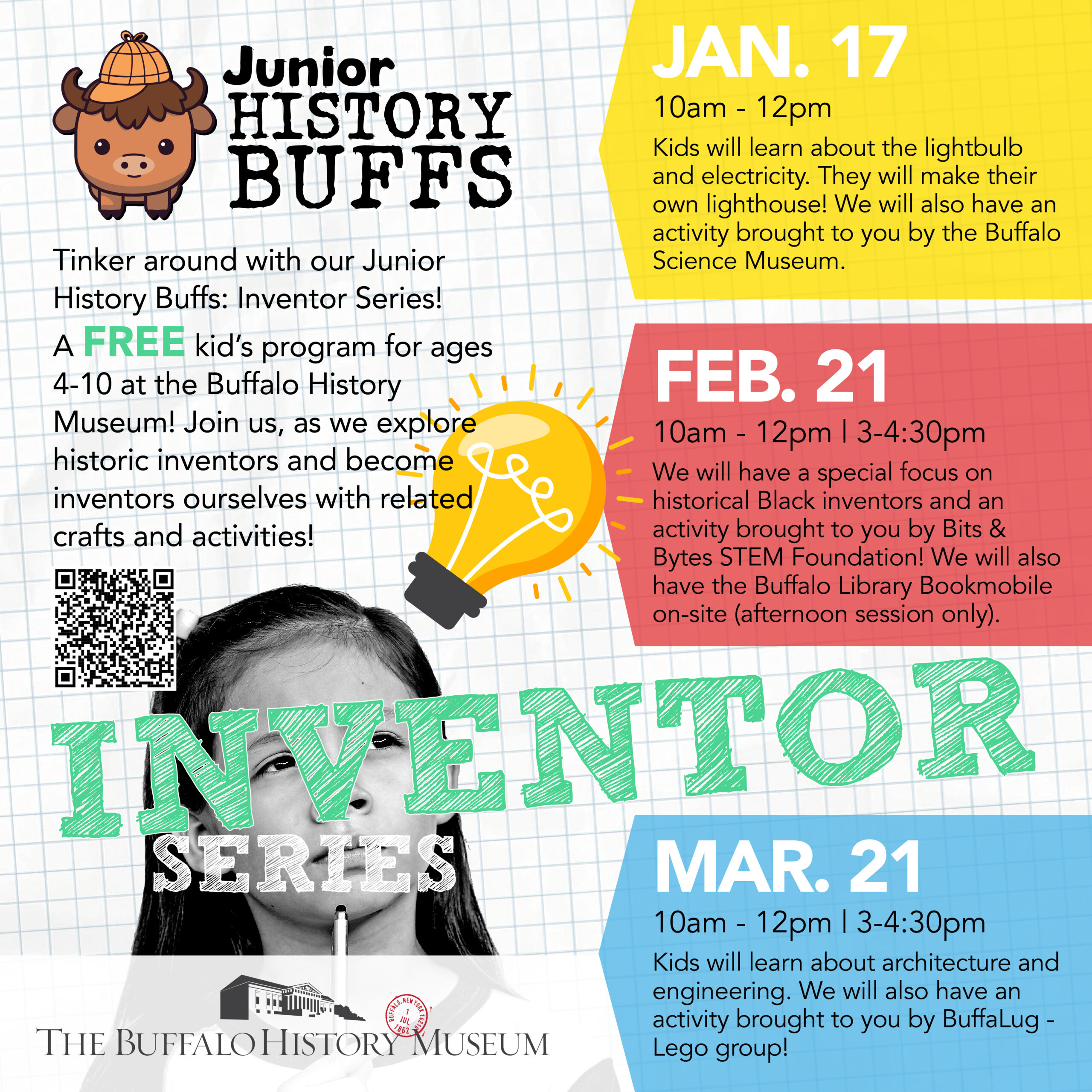 Junior History Buffs is a program at The Buffalo History Museum that engages children ages 4-9 in age-appropriate history lessons, songs, stories, crafts and games. A short program, or “Circle Time,” is instructor-guided and includes songs, a brief lesson about local history and a story. After this, self-guided activities can be enjoyed by the whole… Continue Reading Junior History Buffs: Inventor Series!