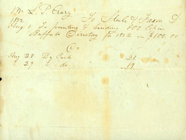 Receipt, Steele & Faxon, August 1832, for printing and binding 600 copies of the Buffalo Directory for 1832.