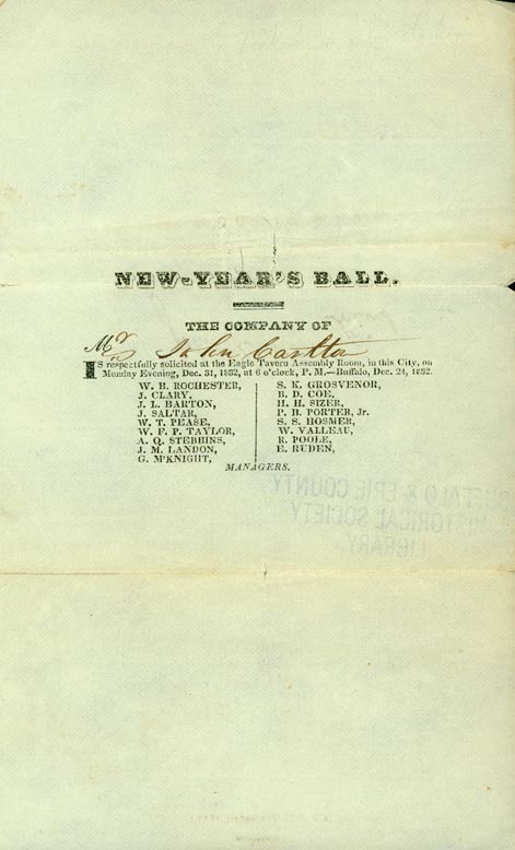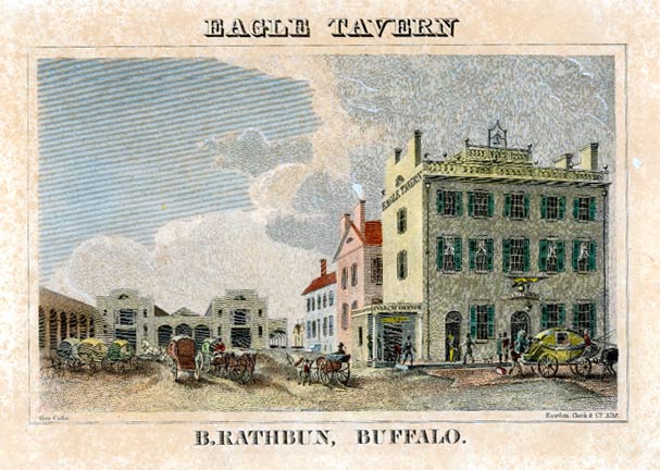 The Eagle Tavern was built in 1816 by Gaius Kibbie on the west side of Main Street, just south of Court. Benjamin Rathbun bought the hotel in 1822, and made it Western New York's premier hostelry and the center of Buffalo's social life. Many prominent men stayed there, including General Lafayette, President Van Buren, Daniel Webster, and Henry Clay. |