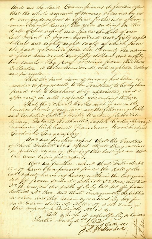 In 1832, common (free) schools still operated under the Act of 1812, which provided state funding based on the number of children in each district. Towns were required to supplement the state fund through taxes, and parents were charged additional fees, known as rate bills. The rate bills kept the poorest children out of the school, but they were not abolished until 1867. |